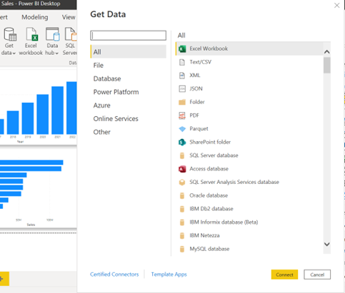 Bước đầu tiên của quá trình phân tích dữ liệu là lấy dữ liệu. Khi nhấp vào nút ‘Get data’ trên tab ‘Home’, nó sẽ hiển thị một loạt các nguồn có sẵn. Tùy chọn đơn giản nhất là từ một tệp, có thể là excel, tệp văn bản / CSV, tệp JSON, v.v. Chúng ta cũng có thể kết nối với cơ sở dữ liệu như cơ sở dữ liệu SQL Server, cơ sở dữ liệu Access,… và nhiều hơn nữa. Một số tùy chọn khác, chẳng hạn như Power Platform, Azure hoặc Dịch vụ Trực tuyến (ví dụ: Salesforce), cũng có sẵn.