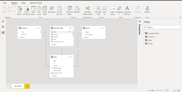 Trong mô hình dữ liệu mẫu bên dưới, để tính toán doanh thu, chúng ta chỉ cần lấy Số lượng Bán hàng từ bảng Doanh số và Giá từ bảng Sản phẩm vì hai bảng đã được kết nối bởi một mối quan hệ.